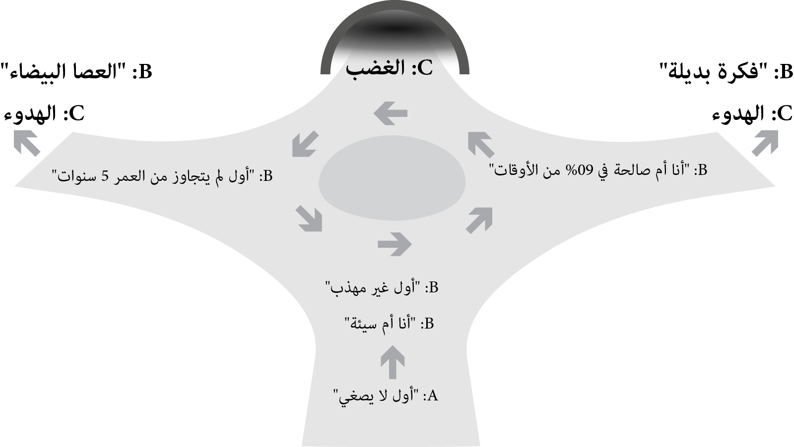 ملاحظة وجود فكرة سلبية تلقائية (B) يحول بينك وبين الانتقال بشكل مباشر من الموقف (A) إلى العاطفة (C).